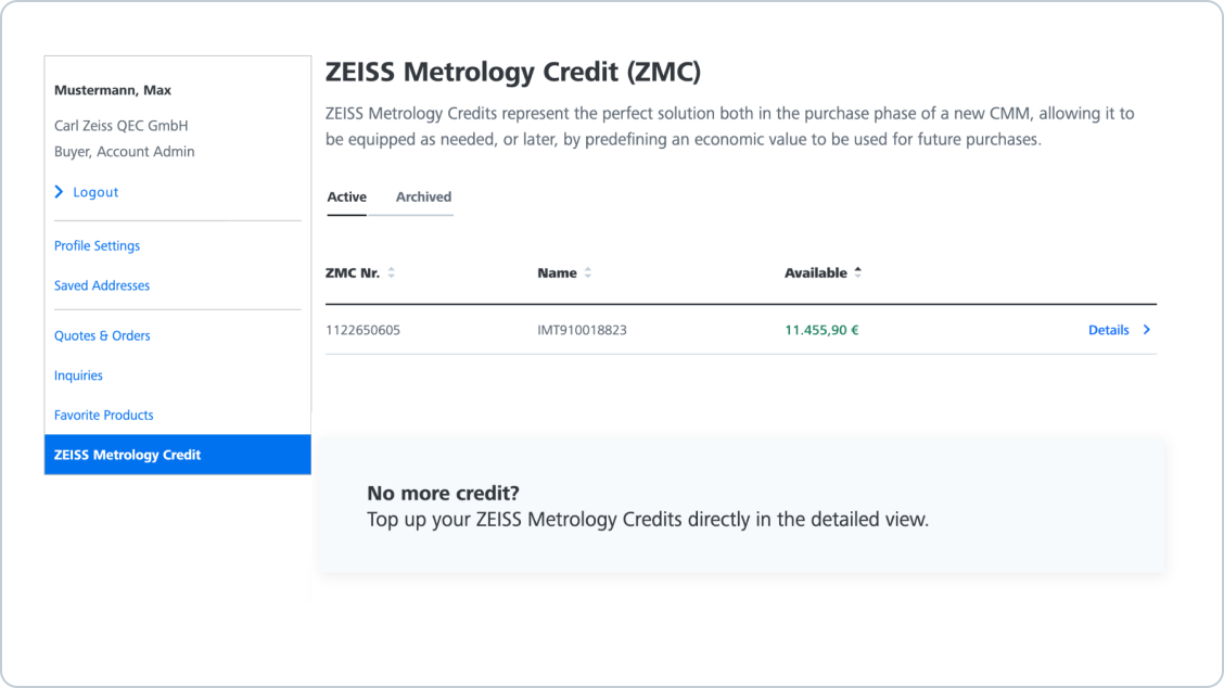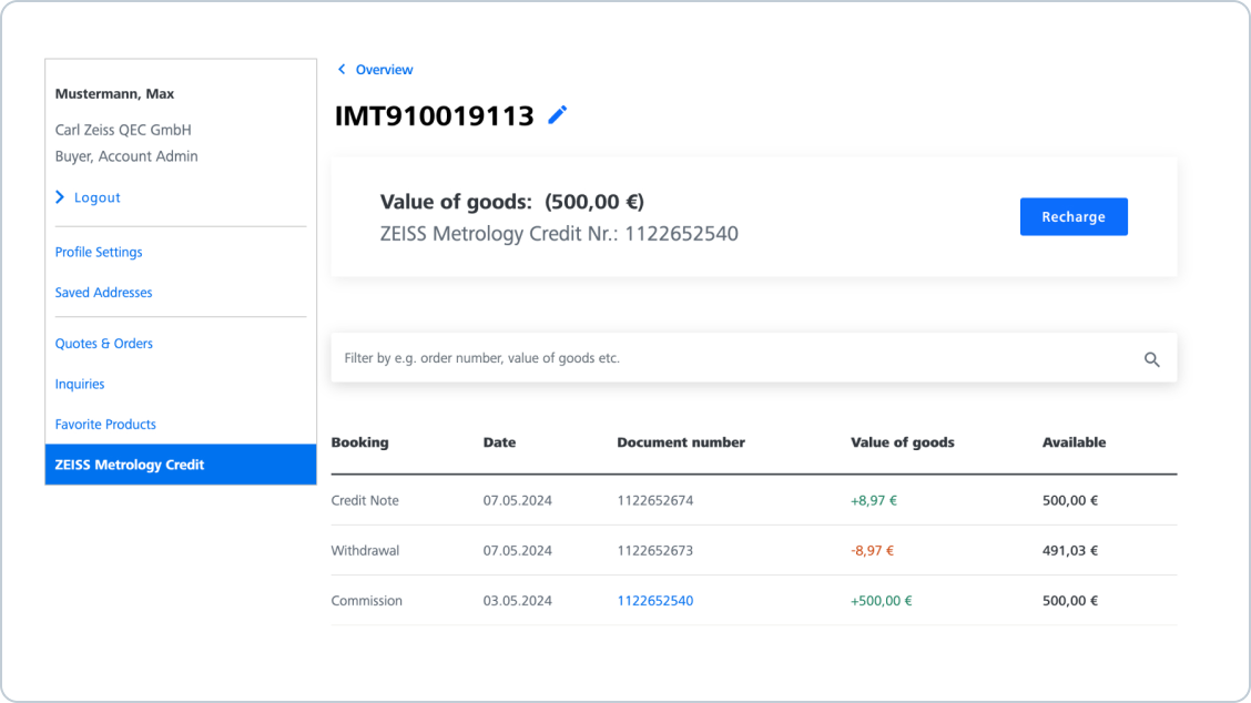 You can top up your current ZEISS Metrology Credits at any time in the "My Account" area. To do this, open the detailed view of the respective ZEISS Metrology Credits, click on "Recharge" and select the desired amount.