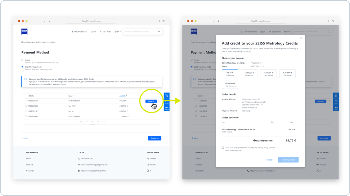 If the balance of ZEISS Metrology Credit is not sufficient to cover the order value, select ZEISS Metrology Credit as the payment method in the "Check-Out" process and click on the "Recharge" button. In the next step, you can choose between the missing difference or a fixed scale value. The desired order can then be paid for directly with ZEISS Metrology Credits.